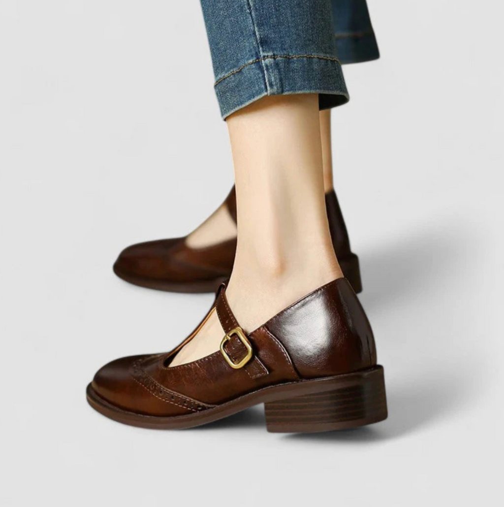 These are the Retro T-Strap Shoes — charming slip-on shoes with a touch of vintage elegance. The classic design with perforated details and a gold-toned buckle gives these shoes a timeless appeal. Thanks to the low heel and soft insole, they offer optimal comfort, making them ideal for everyday wear or for adding a retro touch to your outfit.