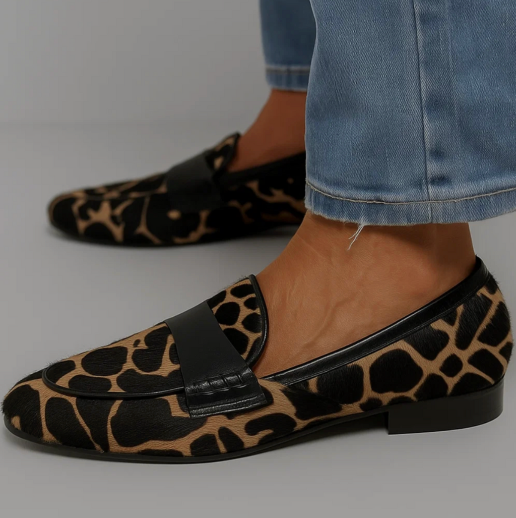 This stylish slip-on stands out immediately thanks to its luxurious giraffe pattern, while the sleek black faux-leather strap across the instep adds a timeless, modern touch. The padded insole provides exceptional comfort, allowing you to wear these loafers effortlessly all day long. Perfect to pair with casual jeans or tailored trousers, making them ideal for any occasion where you want your style and personality to shine.