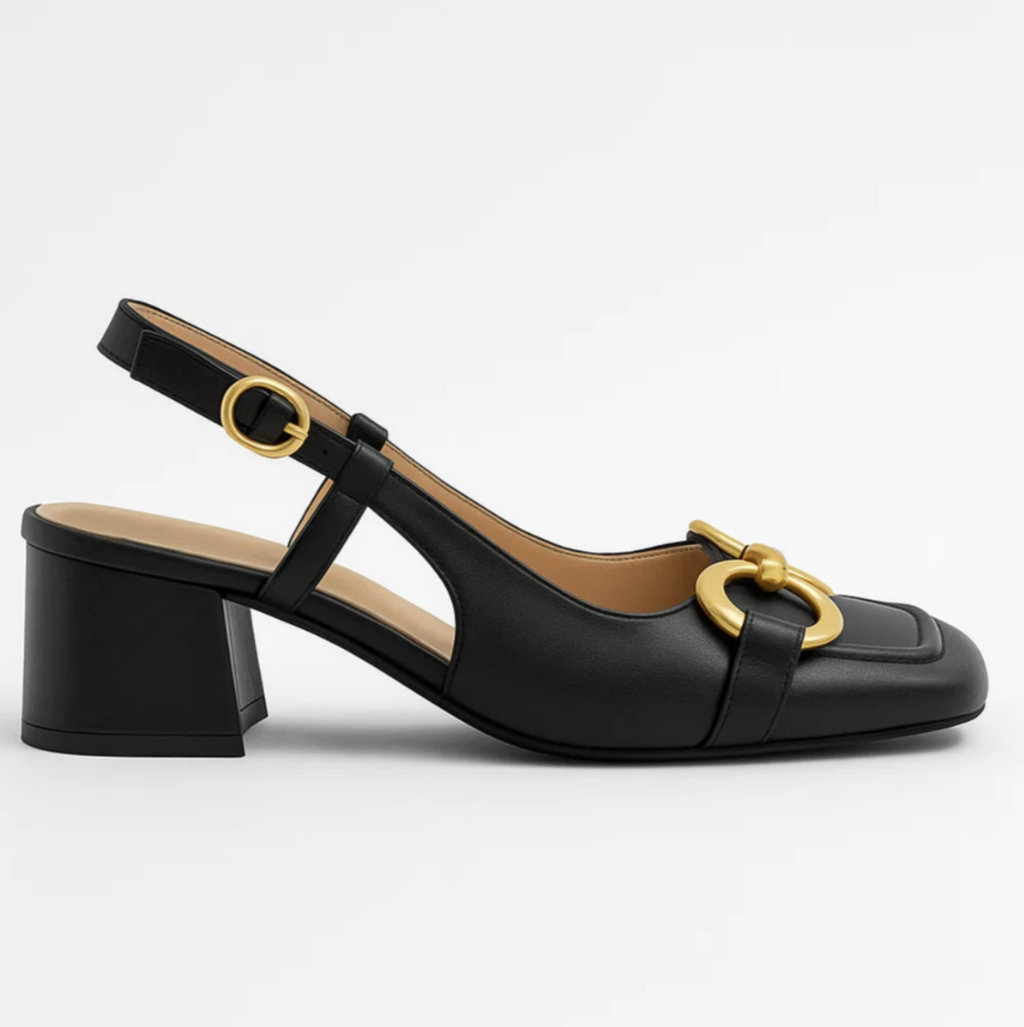 The Slingback Open-Heel Pumps are designed for women who appreciate subtle yet refined style. These shoes blend a classic cream leather-look design with a luxurious gold-tone accent on the toe, making them a perfect match for both modern and timeless outfits. The slingback strap offers an elegant and secure fit, while the square toe and block heel add a distinctive, fashion-forward touch.