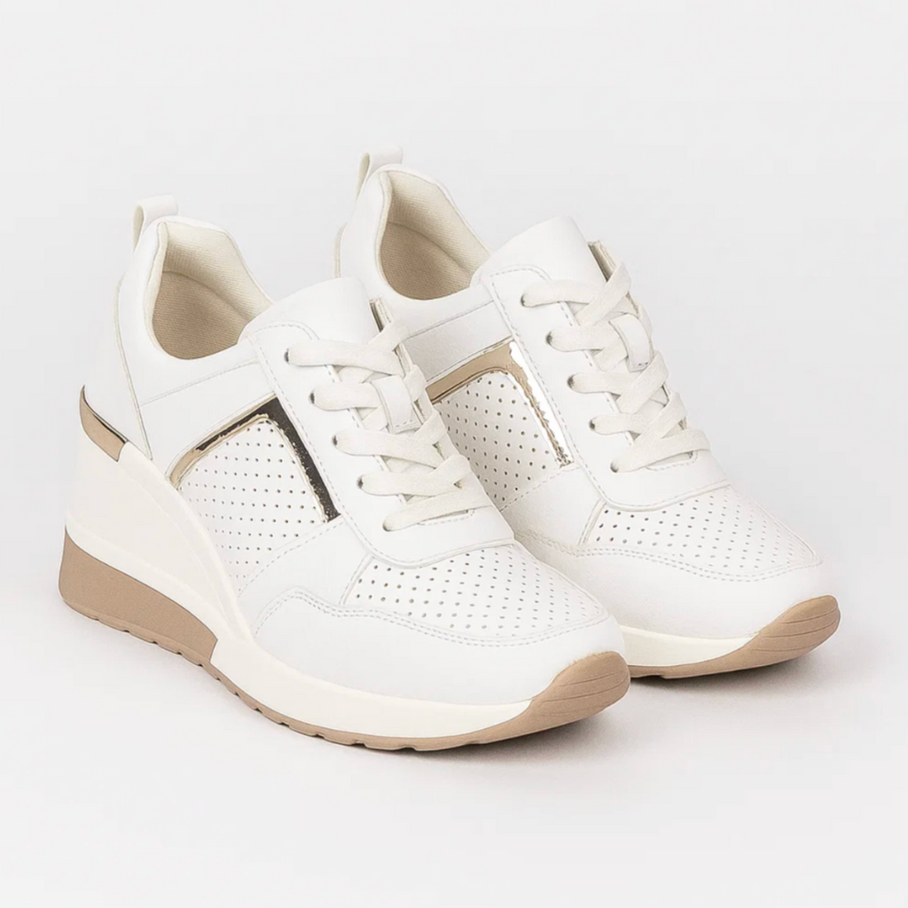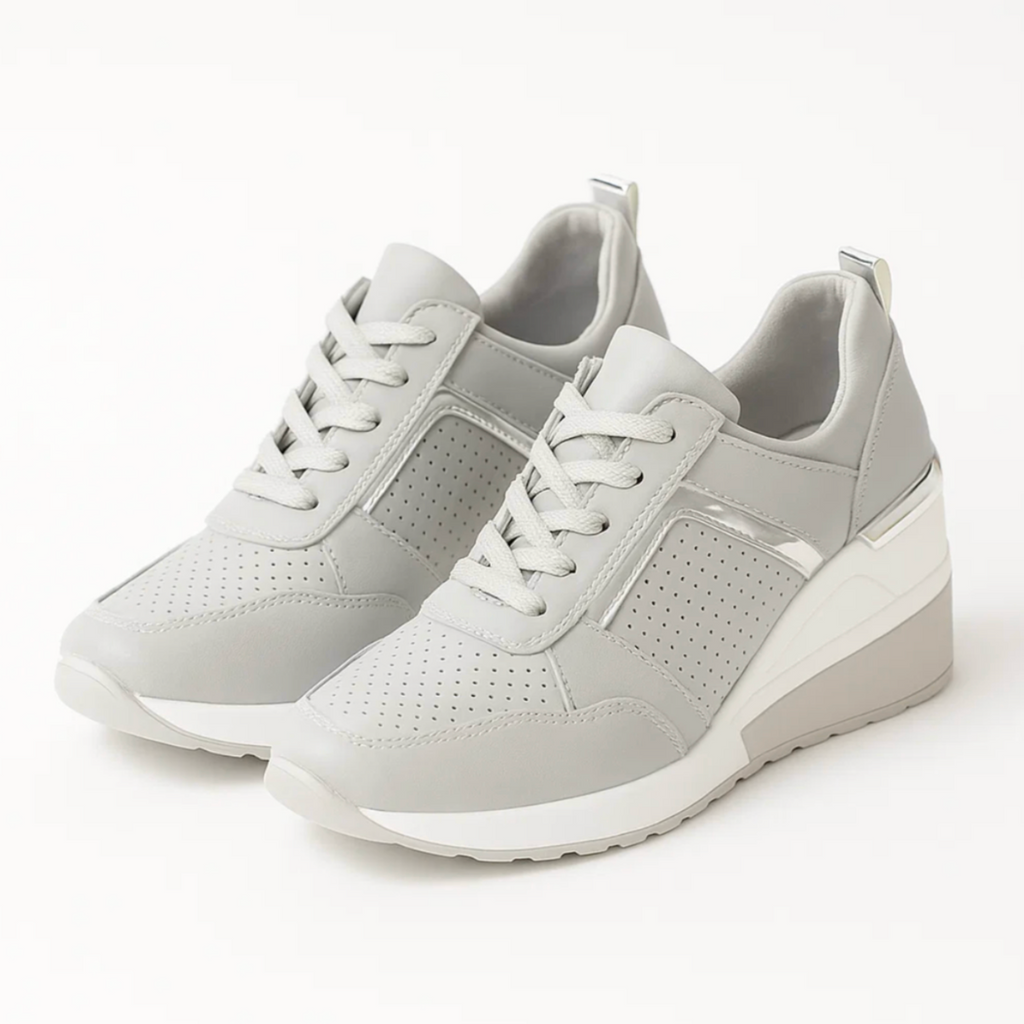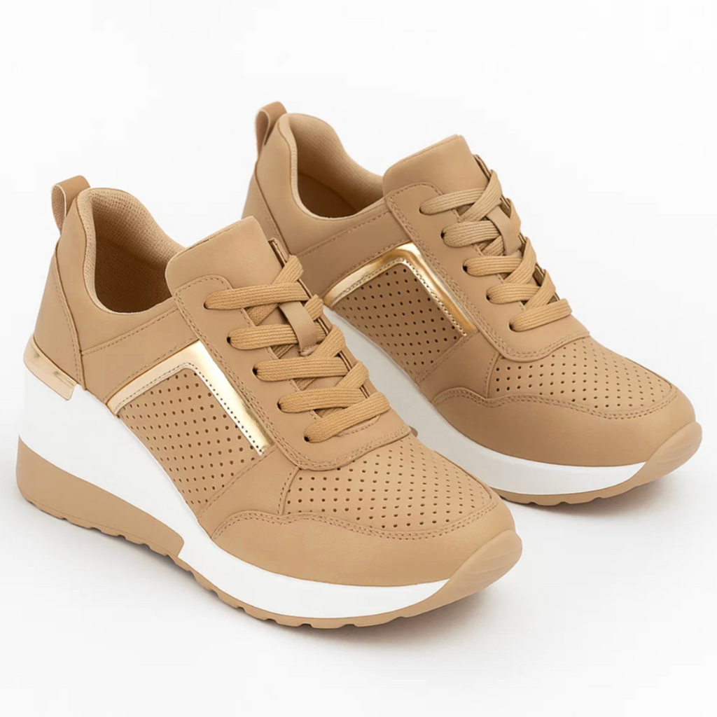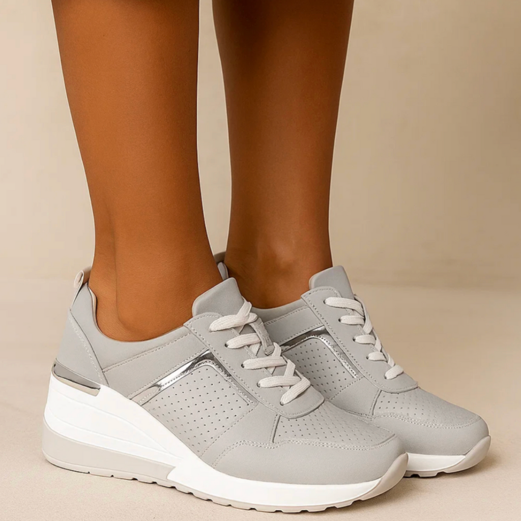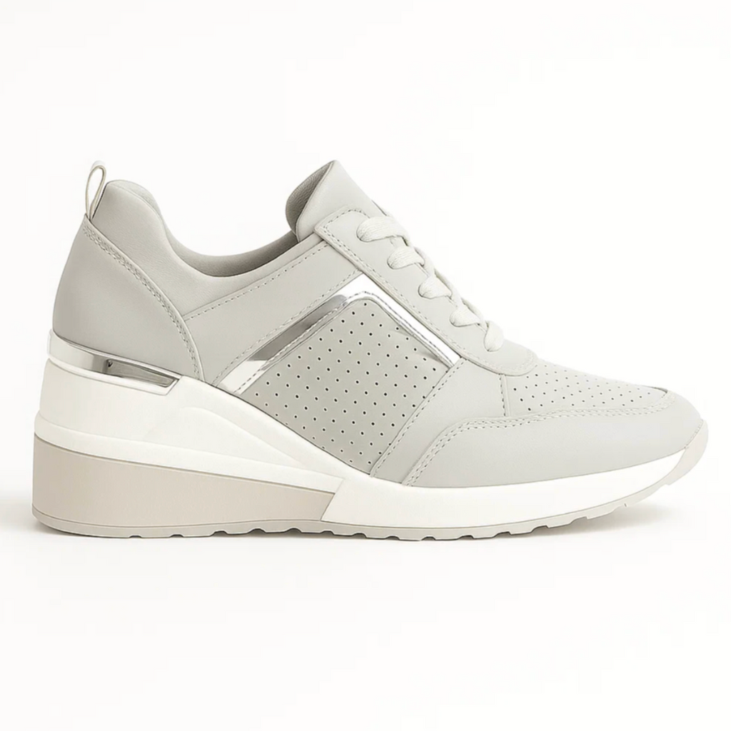 Designed for the transitional season, these sneakers offer the perfect balance between lightness and support. The elegant metallic accents add a touch of luxury, while the soft wedge sole supports your natural posture. Thanks to the breathable material and anti-slip outsole, you can walk through every autumn day with ease — stylish, stable and confident.
