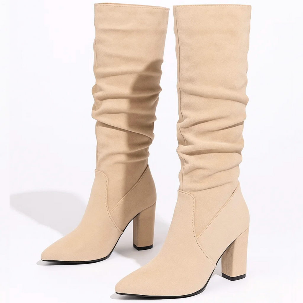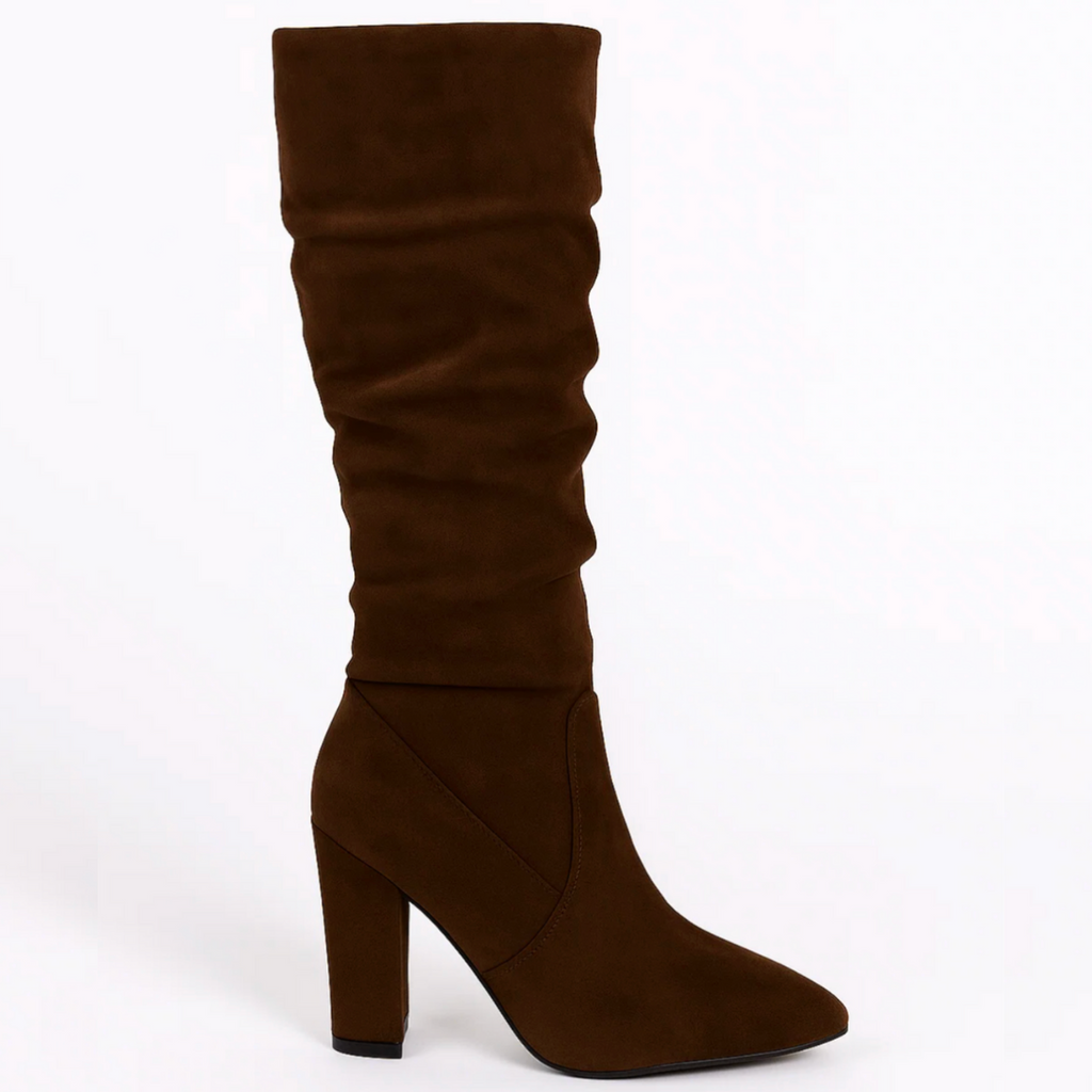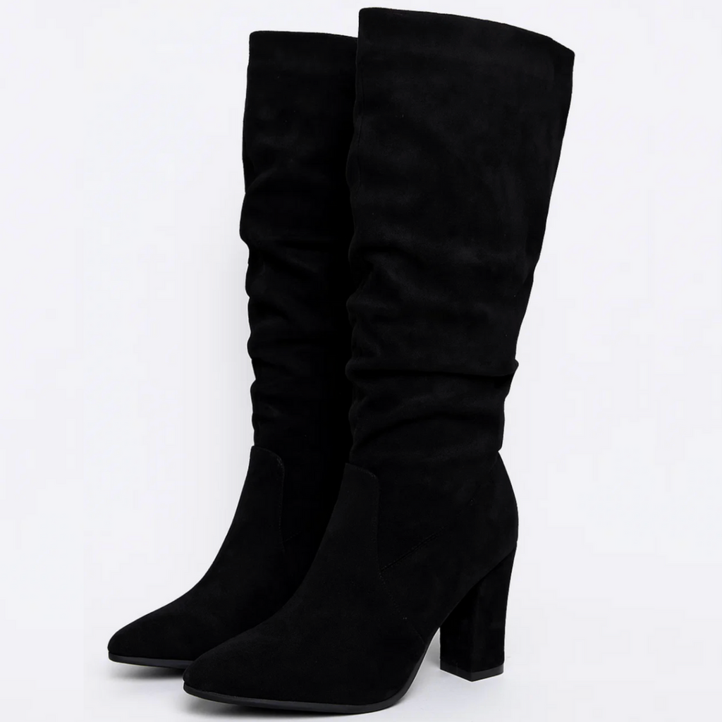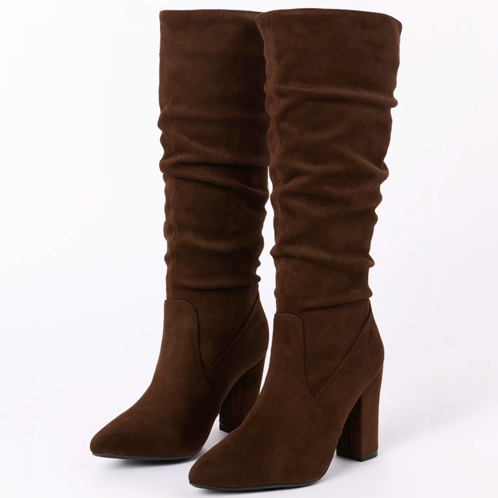 These are the Lana Suede Boots, stylish high boots made from soft suede, designed for an elegant look and ultimate wearing comfort. With their trendy slouchy design and stable block heel, they are ideal for both everyday wear and special occasions.