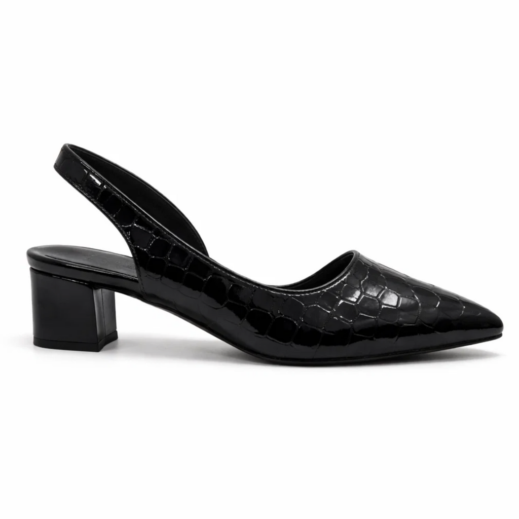 These sleek slingback heels are designed for a refined and contemporary look. Crafted from glossy faux leather with a subtle croc-embossed texture, they add instant sophistication to any outfit. The pointed toe creates a sharp, elegant silhouette, while the sturdy block heel offers balance and a confident stance. Finished with a minimalist slingback strap, this design effortlessly transitions from office wear to evening occasions.